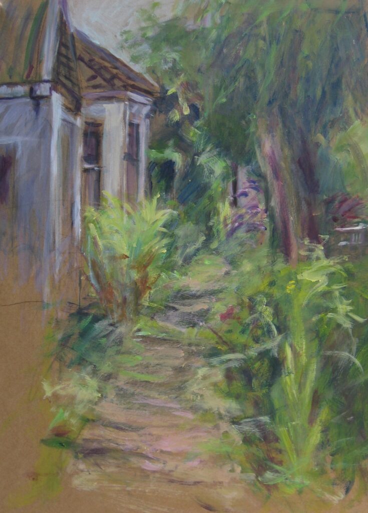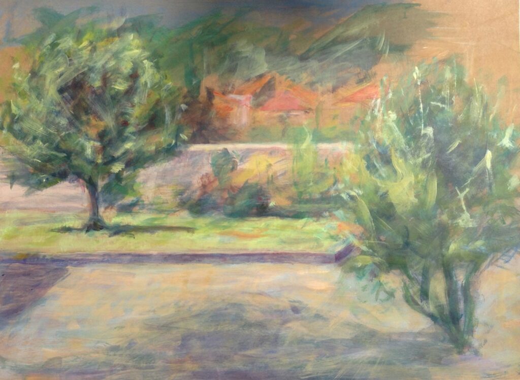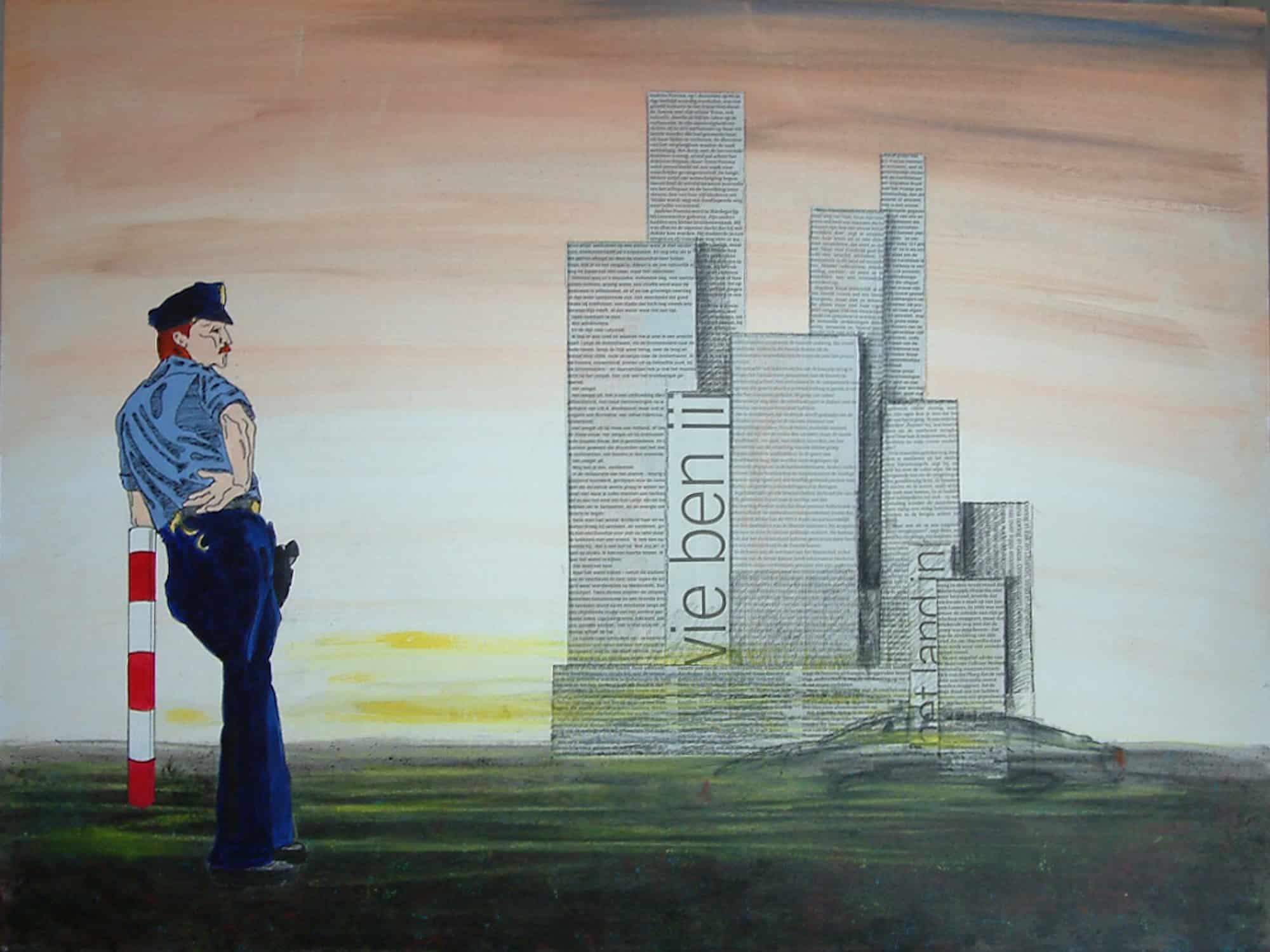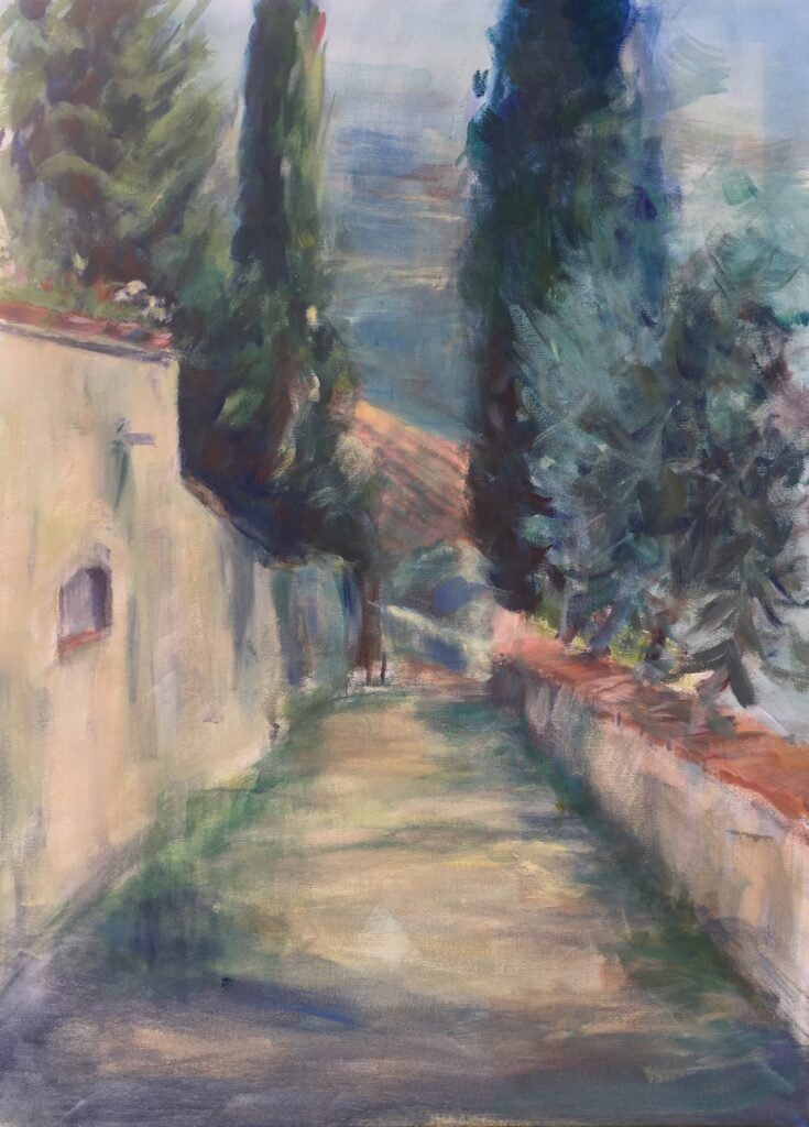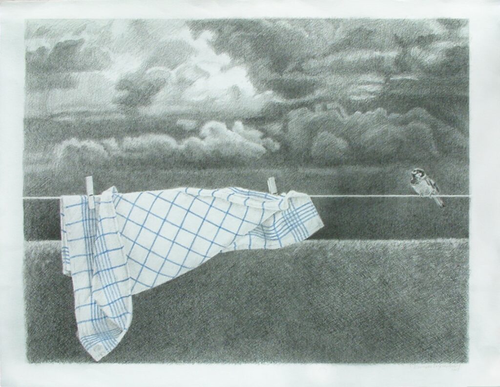 Landschap schilderijen ’s Gravenland, 2012, acryl op kraftliner papier met lijst 63,5 x 49 cm Zomereik, 2012, acryl op kraftliner papier met lijst 47 x 60 cm Huisje aan de Vecht, 2012, acryl op kraftliner papier met lijst 47 x 61 cm Amelisweerd, 2022, olieverf op papier 36 x 28 cm Cypressen in Toscane 2017 Acryl op doek 50 x 70 cm Tuin bij villa Toscane 2013 acryl op kraftliner 60 x 50 cm Abrikozen boomgaard Toscane 2014 60 x 50 cm Duinen bij Wassenaar 2022 Olieverf op jute 70 x 50 in baklijst 74 x 54 Skyline cob Gemengde techniek Mus, theedoek en wolken 2011 Grafiet op papier 42 x 32 cm Terug naar Werk