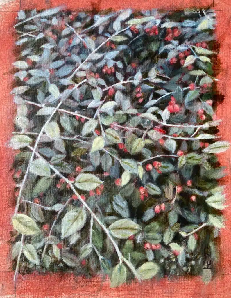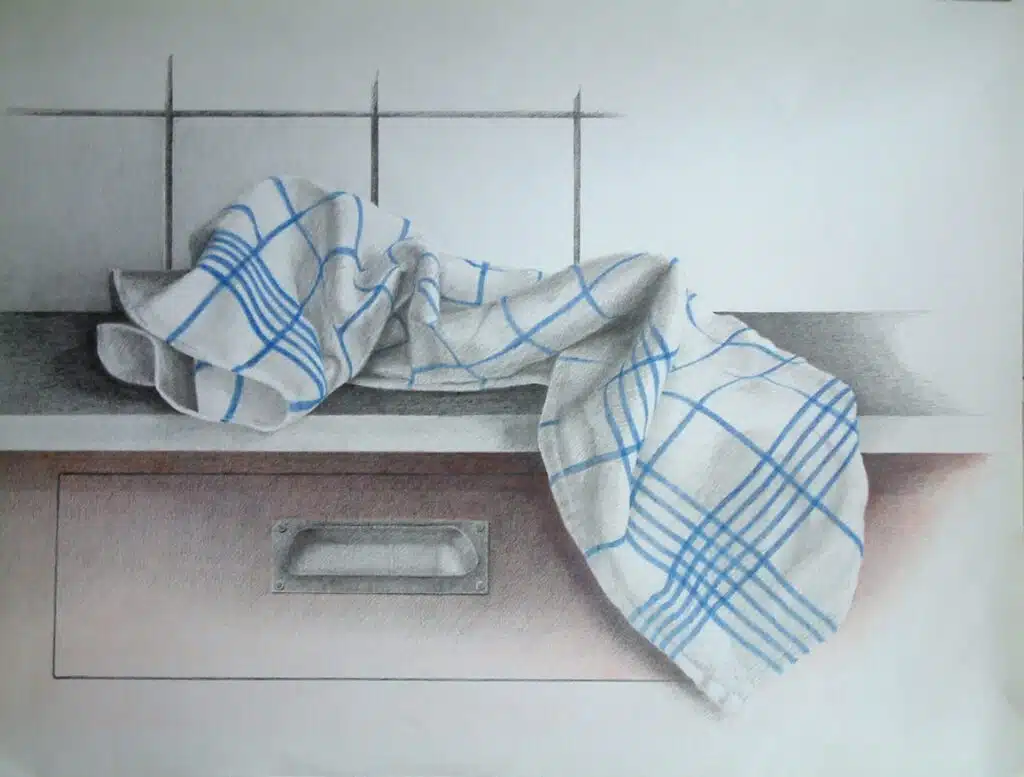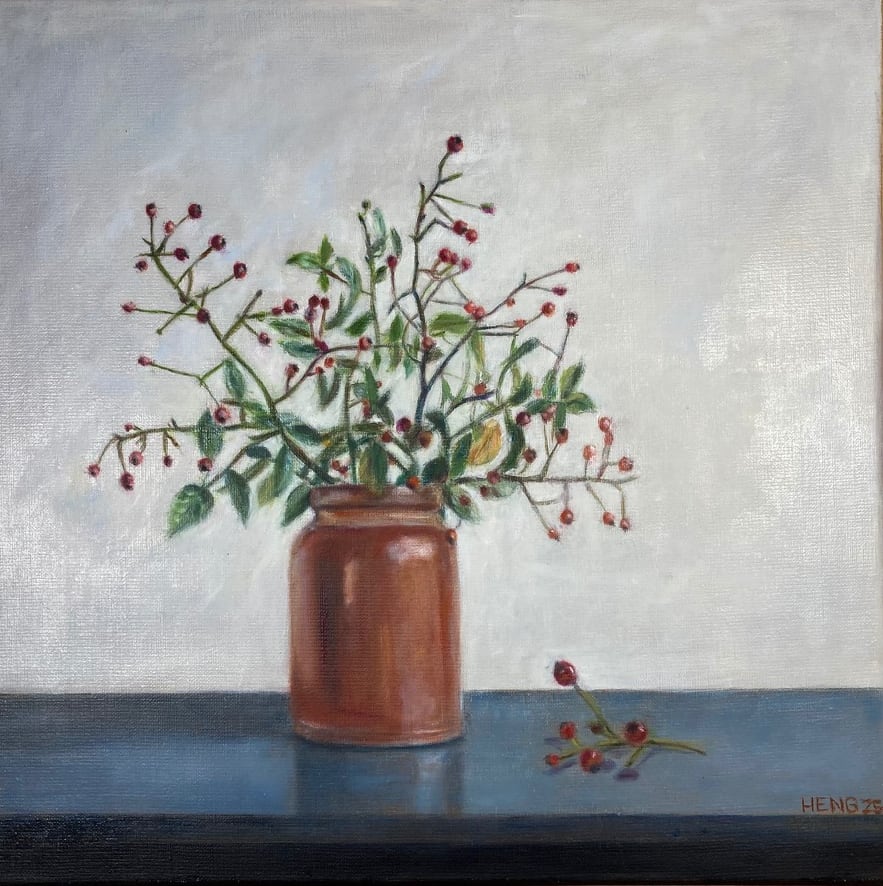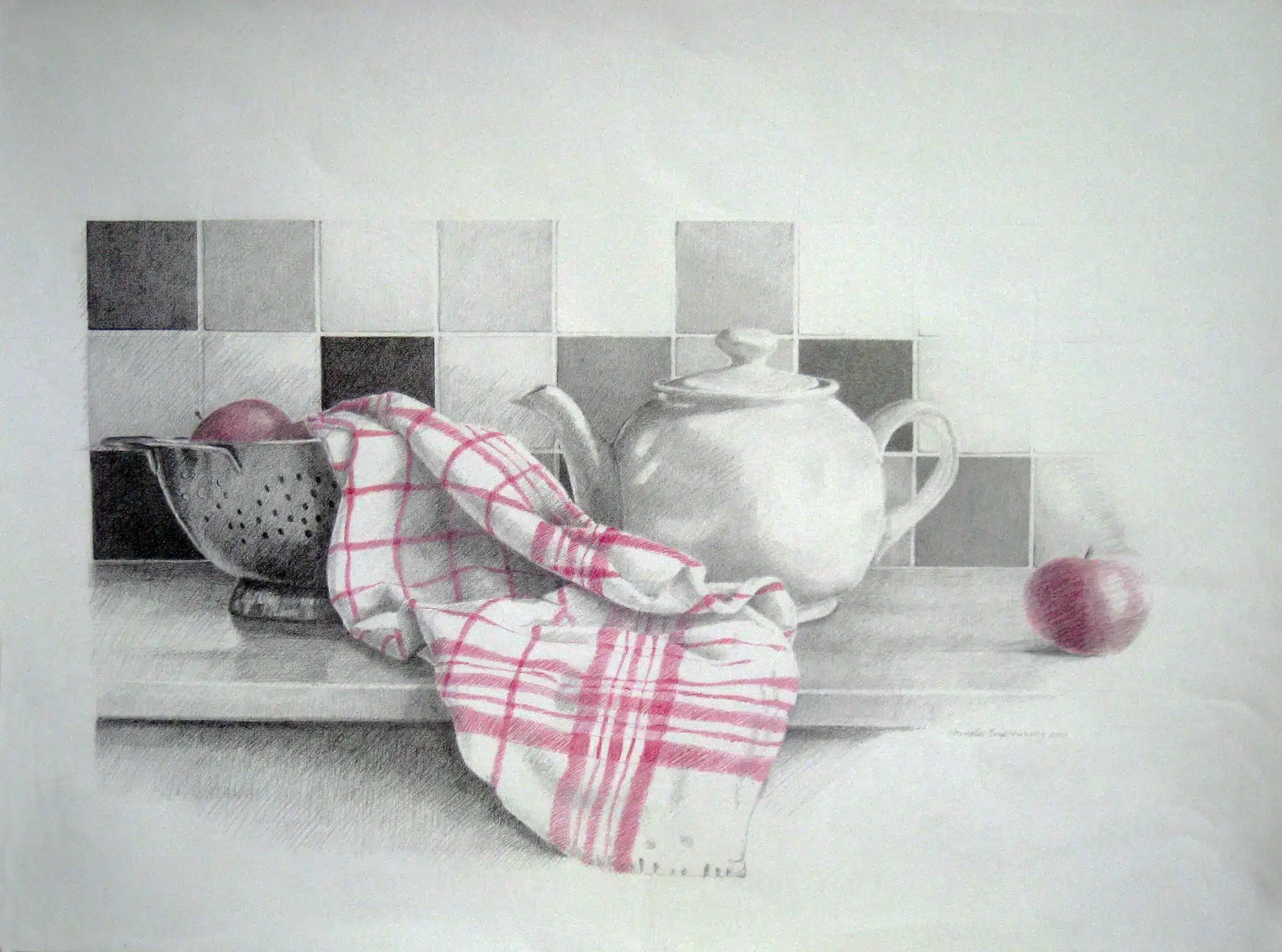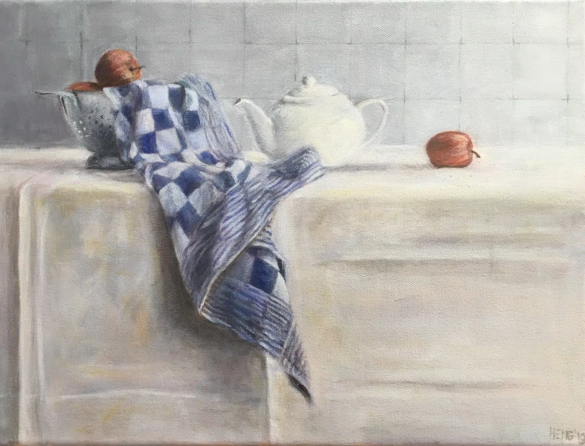 Stillevens Theedoek 1 2007 Grafiet op papier 50 x 60 cm Theedoek. pot en vergiet 2011 Grafiet op papier 50 x 60 Theedoek met pot, vergiet en appels 2020 Olieverf op linnen 40 x 30 cm met lijst 53 x 44 cm Studie appel 2019 voor schilderij ‘Theedoek met pot vergiet en appels Olieverf op linnen 18 x 24 m Cotoneaster 2022 Olieverf op papier 19 x 25 cm Rozenbotteltjes, 2025, 40 x 40 cm olieverf op linnen Terug naar Werk